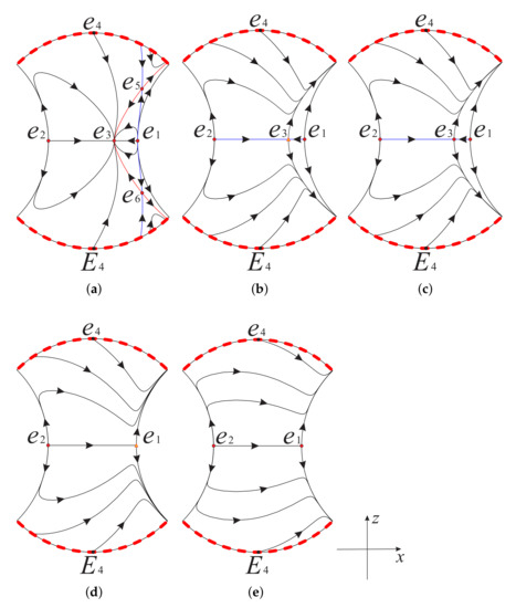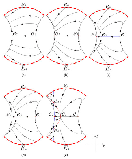 There are five equilibrium points, , , , and , in system (12) when , and the latter three equilibrium points, , and , coincide when . The equilibrium point has eigenvalues 1 and , it is a hyperbolic unstable node when , and it is a hyperbolic unstable saddle when . The equilibrium point has eigenvalues 1 and , it is a hyperbolic unstable node when , and it is a hyperbolic unstable saddle when . The equilibrium point has eigenvalues and , it is a hyperbolic unstable node when or , and it is a hyperbolic unstable saddle when . The equilibrium points and have the same eigenvalues and . They are hyperbolic unstable saddles when , and they are not real singularities when .