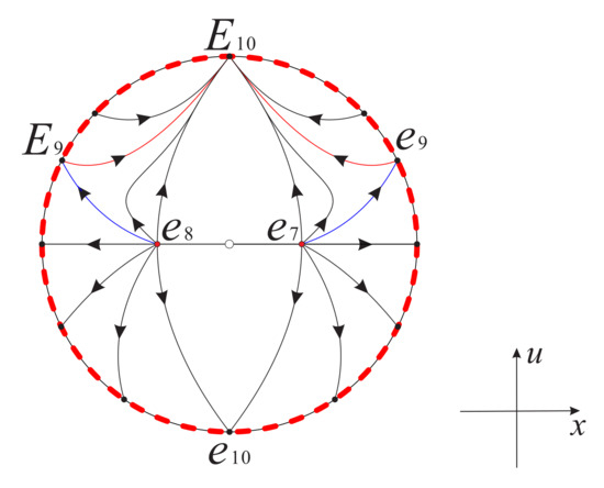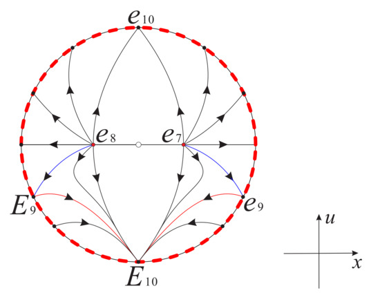 Therefore, combining Figure 8 with Figure 6 and Figure 7, we obtain the global phase portrait of systems (16) and (17) as shown in Figure 9 and Figure 10, respectively.