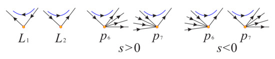 It is obvious that system (18) has a fictitious equilibrium point because , and its eigenvalues are 1 and 3, respectively, i.e. is a fictitious hyperbolic unstable node. The first equation of system (18) shows that when , so y increases monotonically. In contrast, if , then y decreases monotonically. Note that x and y have the same monotonicity when , so the local phase portrait of system (16) near and system (18) near have the same local phase portrait. Then considering the symmetry of system (18), we can find that the local phase portrait of system (16) is shown in Figure 6.