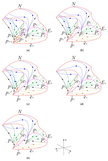 The phase portrait on the invariant plane restricted to the region inside the Poincaré disc for different values of s: (a) , (b) , (c) , (d) , (e) . Here is the diametrically opposite equilibrium point of at infinity.