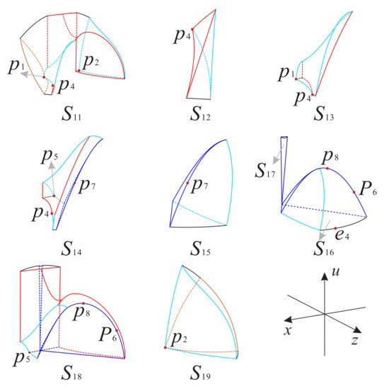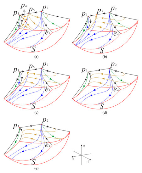 The structure of the subregion is the same as in Figure 32 except that the left surface in this subregion is completely contained in the surface . In addition the subregions and have the same structure as the subregions and in Figure 32, respectively. Moreover, the dynamic behavior of the orbits in the subregions , and is the same as that in the subregions , and , respectively. That is, the orbits in the subregions and originate from their respective infinite equilibrium points on the Poincaré sphere, and then the orbits in enter the subregion and eventually run to the equilibrium points located on the u-axis, and the orbits in go to the origin O or enter the subregion .
