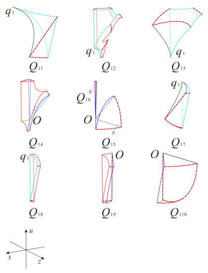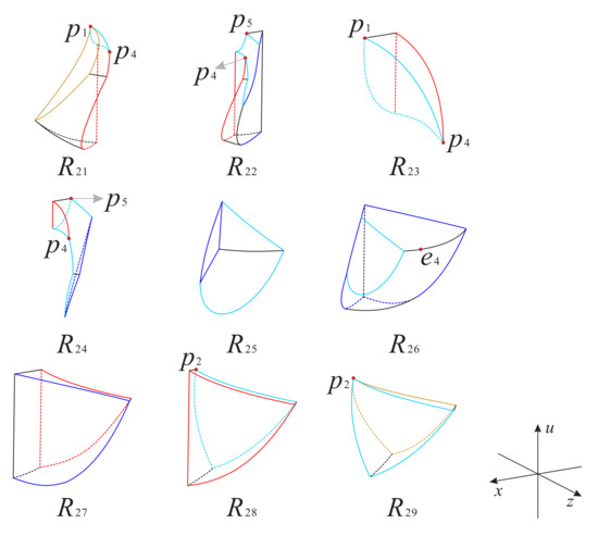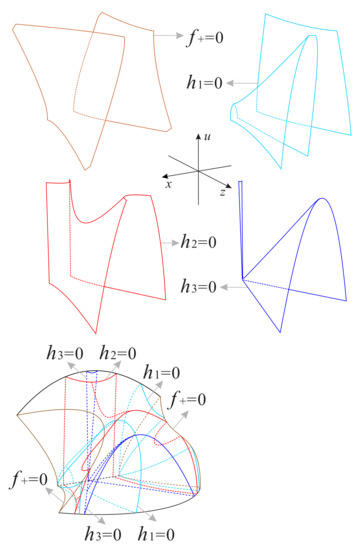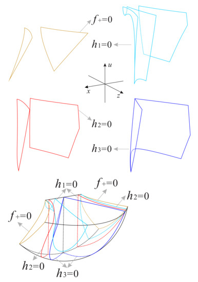 The left side surface and the right side surface in the subregion are contained in the surfaces and , respectively; and the composition structure of the remaining part is the same as the corresponding part of the subregion . The orbits in this subregion monotonically decrease along the positive direction of the three coordinate axes, implying that the orbits start at the infinity equilibrium points on the Poincaré sphere or come from the subregion , and finally tend to the equilibrium points on the u-axis.