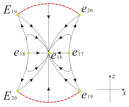 It is easy to find that there are five finite equilibrium points of system (7) because in case I. The equilibrium point with eigenvalues 3, 1 and , the equilibrium point with eigenvalues 3, 1 and , the equilibrium points , , and have the same eigenvalues 2, and , and the equilibrium point with eigenvalues , and . Since different values of s determine the types of these five equilibrium points, we list the relevant results more clearly in Table 3.
