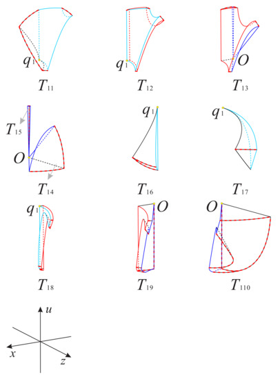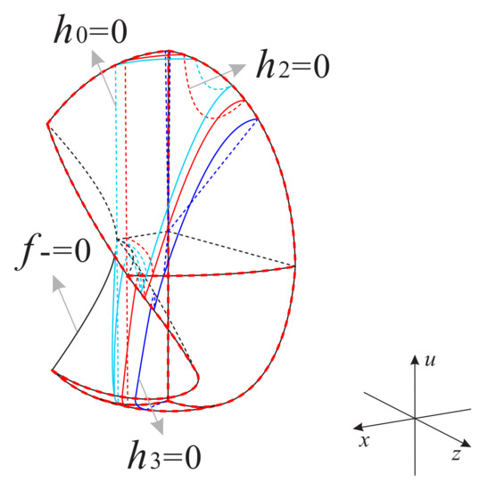 The front and back parts of the left surface of the subregion are contained in the surfaces and , respectively; the right and top planes are contained in the invariant planes and , respectively; and the front and bottom surfaces are contained in the Poincaré sphere. Note that Table 13 states that the orbits in this subregion decrease monotonically along the positive direction of the x-axis and z-axis, and increase monotonically along the positive direction of the other coordinate axis. Then the orbits in this subregion start at the infinite equilibrium points on the Poincaré sphere and eventually tend to the finite and infinite equilibrium points on the u-axis.