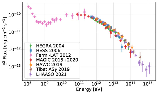 Focus on the gamma-ray spectrum of the Crab nebula. Data from different instruments are shown with diverse symbols/colors—namely, green rectangles for HEGRA data [54], blue squares for HESS data [55], pink circles for Fermi-LAT ones [56], red diamonds for MAGIC data [57,58], orange stars for HAWC [59], brown triangles for Tibet AS- [60], and violet ones for LHAASO data [61]. Figure courtesy of Michele Fiori.