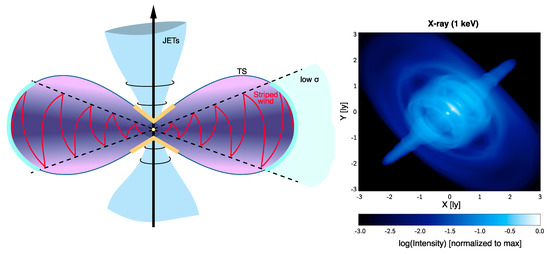 A schematic representation of the flow geometry can be seen in the left panel of Figure 3. In the right panel of the same figure, we show a simulated X-ray image of the Crab nebula.