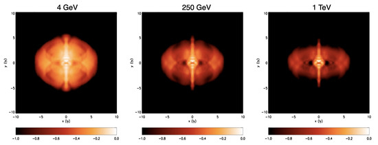 As far as Gamma-Rays are concerned, no detailed morphological information is available, due to the very limited angular resolution of gamma-ray telescopes. For a long time, the only available information simply constrained the gamma-ray nebula to lie within the radio synchrotron one [55,78,79]. The first direct measurement of the Crab nebula extension in Gamma-Rays became available last year, thanks to the H. E. S. S. telescope [80]. With the analysis of 22 h of observations collected during 6 years of operation, the PWN radial extension was finally determined: it turns out to be ∼ in the 700 GeV-5 TeV energy range, and hence, smaller than in the UV (where the extension is ∼) and very similar to the X-ray size (∼), which is perfectly consistent with a picture in which TeV Gamma-Rays are produced by synchrotron X-ray emitting particles. This is also in very good agreement with the results of the only available effort at computing simulated gamma-ray emission maps of the Crab nebula [81]. In this work, the IC emission was computed on top of a 2D MHD numerical model and maps were produced for different photon energies, showing a shrinkage with increasing energy similar to that observed between radio and X-rays. This can be seen in Figure 4, which also clearly shows how the jet-torus structure should become visible again at TeV energies. Probing the nebular morphology at this level of detail in VHE Gamma-Rays is however beyond the reach of current and planned instruments [82].