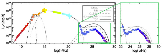 Total integrated spectrum of the Crab nebula computed on top of the 2D MHD numerical model by [77]. The zoom-in on the gamma-ray spectrum highlights the fact that the IC emission can be correctly reproduced if the magnetic field strength is artificially rescaled so as to ensure an average value of ∼200 G (this is how the spectrum in the inset is obtained). Different symbols-colors reproduce data at the different energy bands, as taken from [83] and references therein.