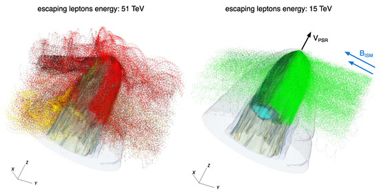 Maps of bow shock nebulae from 3D MHD simulations with density contours (in gray color) and the flux of escaping leptons (of two different energies). Dots of different colors indicate particles injected at different locations in the pulsar wind: the majority of escaping particles are injected in the polar region of the wind (red and green), while very few of them come from the equatorial region. In both plots, the PSR direction of motion is aligned with the Z direction, while the magnetic field, with strength (with the ISM mass density) lies in the orthogonal plane. Plots have been elaborated based on the simulations presented in [138]. The figure on the left is reprinted from Olmi Bucciantini 2019 © 2019 Olmi Bucciantini.