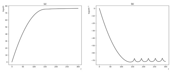 Figure 1 shows a numerical solution to (23) displaying inflation during the large curvature regime. Initial values are chosen to satisfy the slow-roll conditions, and we set . The scale factor increases from the order of up to , which corresponds to, roughly, 73 e-folds. From that point, we obtain an oscillating amplitude superimposed on an overall expansion but without inflation (this corresponds to the flattened part of the curve in Figure 1a). At the final time displayed, we have in total 76 e-folds, approximately.