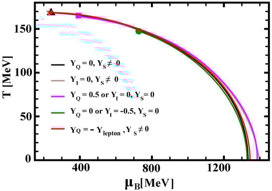 Analyzing Figure 2 in more detail, one can see that both lower charge or isospin fraction and the constraint of zero net strangeness weaken the phase transition, shifting the critical end point to a lower temperature (and, as a consequence, to a larger ). When combined, these features cause the green curve to shrink and the green dot to be found more than 21 MeV below the beige inverted triangle, which represents the “opposite” case ( and ). A lower critical temperature means that the first order transition between the phases becomes weaker faster with the increase of temperature compared to the other cases. This can be seen in the size of the discontinuity in energy density or other derivatives of the grand potential across the transition and it is related to how different or similar the two phases are. The coexistence line for the chemically-equilibrated case is clearly more similar to the cases at low temperatures (when is more negative, see Figure 2 of []), and becomes slowly more similar to the at large temperatures, when strangeness is abundant.