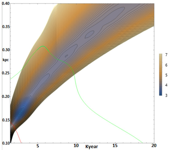 Figure 2 shows a map of the lines of the level (by one degree of freedom): the darker the shade, the less . The age of the source in thousands of years is plotted along the abscissa axis, and the distance to the source in the kpc is plotted along the ordinate axis. The red winding line corresponds to the energy level erg; the green one corresponds to the level erg.