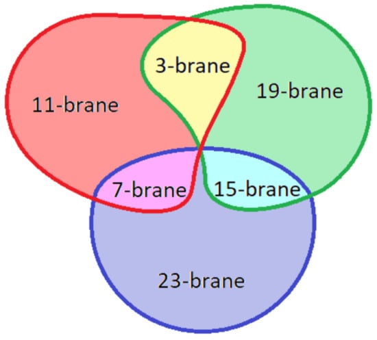 Throughout this section, it is assumed that three generations of the standard model stem from a 3-brane and dual 7-brane, immersed in an 11-brane worldvolume. To go beyond the standard model and include dark matter candidates, a 15-brane is also considered. The 3-brane and 15-brane exist inside a 19-brane worldvolume. The possible p-branes in are shown in Figure 2. In particular, visible matter and dark matter are isolated on the 11-brane and 19-brane, such that they intersect on the -brane worldvolume for space–time. In this manner, the braneworld intersection identifies visible and dark matter with different forces, yet they exist within the same space–time. The theory may be isolated to for dark matter, yet reduced to for visible matter.