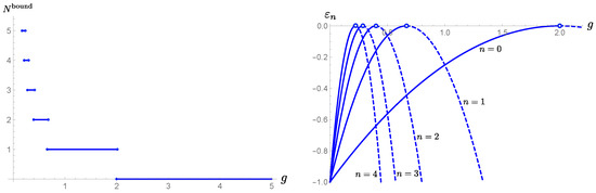 Let us recall the exact spectrum (17). At first glance, it seems to give an infinite number of the eigenvalues for . This is not the case. As seen above, for relatively large n, becomes imaginary. How do we exclude such n’s by looking at only the spectrum (17)? In the representation (17), this is understood as two branches of the square root of . We show in in the right panel of Figure 3 the spectrum against the parameter g. For a given negative energy ranging , we have two with quantum number n corresponding to different g. The left branch (solid line) gives the physical bound state energy because it is continuously connected with the classical point . The right branch (dashed line) is an unphysical mode that does not satisfy the bound state boundary condition.6 For a fixed value of g, highly excited states are mostly on the unphysical branch.