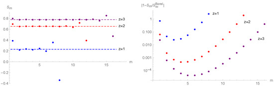 We plot some values of for , and in Figure 5. Obviously diverges when m gets large. The dashed lines are the values of the Borel summation (see Appendix B.2) of the infinite sum . By setting in (A142), the Bore sum of is analytically given by:
