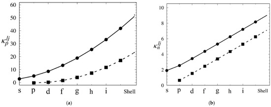 Maximum magnetic susceptibility related to a half-filled shell = ½ for protons—(a) and neutrons—(b). Solid lines and circles indicate the case j = l + ½; dashed lines and squares represent subshells with j = l − ½.