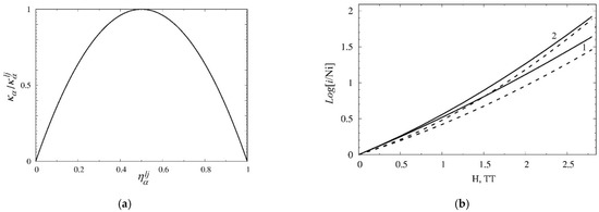 As is mentioned above, the presence of magnetic induction can affect the yield of iron-group nuclei. Let us consider the normalized yield coefficient of antimagic even–even symmetric nuclei of the 1 shells and the double magic nucleus Ni, i.e.,. As seen in Figure 2b, the volume of synthesis of Ti and Cr increases sharply with growing magnetic induction. We notice that deformations of 44Ti and 48Cr, see [12,13], are consistent with the valent nucleons’ magnetic alignment. Exponential approximation based on a free energy Equation (2) overestimates such an increasing effect, especially at high magnetic induction. It is worth recalling, in this connection, the mysteriously large abundance of titanium obtained in direct observations of SN-type II remnants, see refs. [4,5]. Observational data suggest a Ti nucleus yield for type II SNe far exceeding model predictions and similar results for type I Sne. As one can see from Equations (1), (2) and (4) and Figure 2b, the magnetic increase in the synthesis of nuclides by an order of magnitude corresponds to a field strength of several TT. Such magnetic induction is consistent with simulation predictions and an explosion energy of CCSNe [4,7].