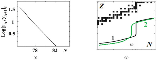 with neutron density nn, and nucleon mass M, and the neutron separation (or binding) energy δn(A + 1) for the nucleus (Z, A + 1). The abundance portions depend only on nn, T and δn. Neutron separation energy δn thereby introduces a dependence on nuclear masses, namely a nuclear mass model for these very neutron-rich unstable nuclei and conditions of r-process: Nn~1020 cm−3, T~109 K at timescale ≤ 1 s. As is illustrated schematically in Figure 3b, the r-process path proceeds through a chain of nuclei with small neutron separation energy δn located away from the stability line. The dynamic rate along the r-process nuclei is determined by β-decays. Since β-decay periods are longer for nuclei closer to the stability region, the nuclear material is concentrated near the upper corner of the kinks in the path at the neutron shell closures N = 50, 82 and 126. The mass numbers A along the path at the neutron shell closure (Nshell) are smaller than mass numbers on the stability line with the same neutron shell closure Nshell. This feature persists after β-decay chains bring nuclei to the stability line at the end of the process and gives rise to a peak of r-process nuclei.