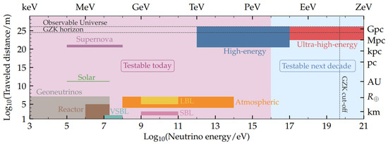 Figure 1 shows the phase space of the new physics one can explore with neutrinos [16]. Here, the horizontal axis is the neutrino energy, and the vertical axis is the propagation distance of neutrinos from source to detector. Large areas, below 100 GeV and 100 km, are explored by anthropogenically produced neutrinos (e.g., reactor, short- and long-baseline, or SBL and LBL neutrino experiments) and low-energy astrophysical neutrinos (solar and supernova neutrinos). However, higher energy and longer baseline have not been explored. High-energy astrophysical neutrinos travel over 100 Mpc, and they can explore new physics, which are extremely weakly coupled with neutrinos, such as LV. High-energy astrophysical neutrinos can also reach PeV energies and may enhance the new physics, in relation to power-counting nonrenormalizable operators [14].
