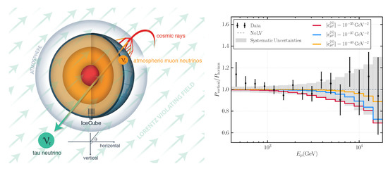 Left, artistic illustration of the search for LV with atmospheric neutrino oscillations. Atmospheric neutrinos are produced in the upper atmosphere, and their flavors may be converted due to couplings between neutrinos and LV background fields as they propagate. The effects induced by the new physics are negligible if neutrinos travel a short distance, namely for neutrinos entering the IceCube volume from the horizontal direction. However, neutrinos are produced near the northern sky travel a long distance before they reach IceCube, and they are significantly more impacted by interactions with the LV background fields. Right, expected atmospheric neutrino oscillation probability ratio with function of energy due to LV. Here, the vertical axis is the double ratio of oscillation probability for neutrinos, from the vertical to horizontal direction. No LV is adjusted to the unity in this figure. Nonzero LV modifies this ratio, and the larger deviations happen with the larger LV couplings. The figure shows the sensitivity to , one of dimension-six operators, which parameterize LV and this analysis is sensitive with. Figures are adapted from [63].