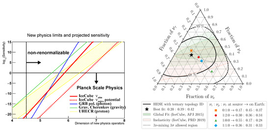 Left, the LV sensitivities of different systems. The sensitivity is normalized with the Planck energy () assuming LV arises from Planck-scale physics. This means that the natural scale of a dimension-five LV operator is , a dimension-six LV operator is , and so on, and the sensitivity is normalized, so that these numbers appear to have unity. Lines are gravitational Cherenkov emission [67,68], GRB vacuum birefringence [69], UHECRs [12], atmospheric neutrino oscillations [63], and the expected sensitivity from the high-energy astrophysical neutrino flavors. Figure is adapted from [66]. Right, HESE flavor ratio measurement by IceCube. Each corner represents electron, muon, and tau neutrino dominant state. The standard scenarios (dotted line area) give roughly ∼(1:1:1) on the Earth, regardless of the assumption of the flavor ratio at the source. This means the expected flavor ratio on the Earth is always around the center of this plot, in standard assumptions. On the other hand, current data contours enclose a large area, so different standard scenarios cannot be distinguished. Figure is adapted from [70].