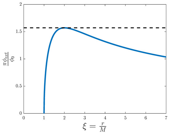 External magnetic flux versus the adimensional distance for the simulation of a Schwarzschild black hole. The dashed line represents the threshold value .