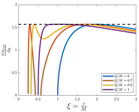 External magnetic flux versus the adimensional distance for the simulation of a Reissner–Nordstrøm black hole, for different values of . The dashed line represents the threshold value .
