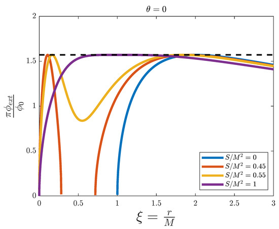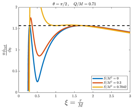 In Figure 8, () and . Thus, as with the Kerr black hole at the axis of rotation (see Figure 4), the ergosphere is not visible even with nonzero angular momentum (red and yellow lines). The blue line is the limit of no angular momentum, and therefore is a Reissner–Nordstrøm black hole. It has , so splitting of the flux occurs between the inner and outer horizons (see discussion at the Reissner–Nordstrøm subsection). The red profile with presents no splitting, so for some value of B between 0 and 0.3 the spacetime is simulable between the horizons. Note that as in Reissner–Nordstrøm black holes, the spacetime cannot be simulated for small values of r, as opposed to Kerr black holes, which are simulable down to . Therefore, this seems to be a consequence of nonzero charge. The yellow profile corresponds to an extremal Kerr–Newman black hole (), with coincident event horizons at . As the ergosphere is infinitely thin at this radial section, we can simulate it for all possible values of angular momentum and obtain event horizons, which could emit Hawking radiation. However, once again, the extremal black hole presents a large region of magnetic flux close to its threshold value. To avoid technical issues, only large values of M could be simulated in this case, in order to minimise the region of the simulator with high flux values.