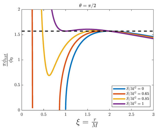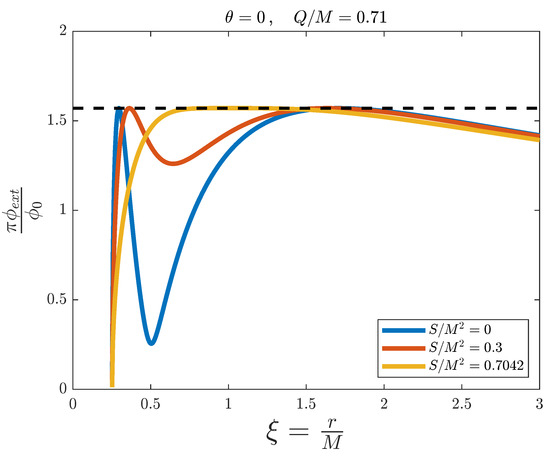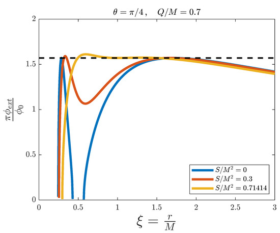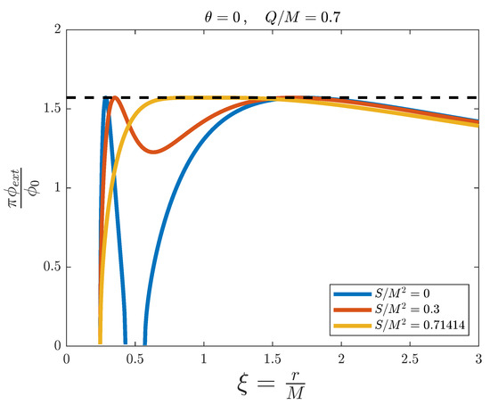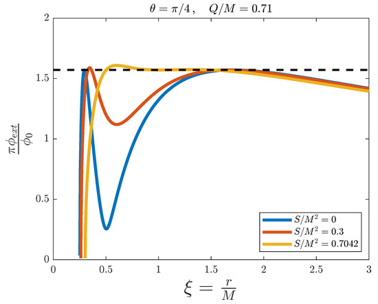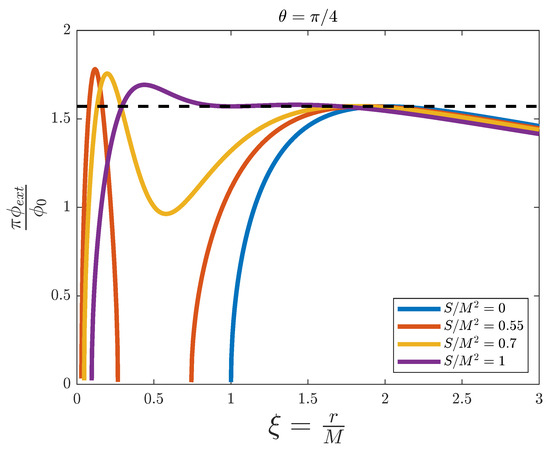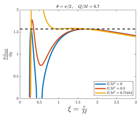 External magnetic flux versus the adimensional distance for the simulation of a Kerr–Newman black hole with fixed and , and for different values of . The dashed line represents the threshold value .
