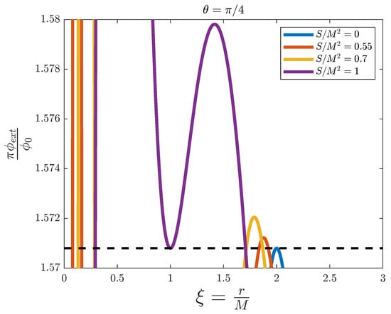 In Figure 5, we have fixed . Again, the limit is represented by the blue line and corresponds to the Schwarzschild black hole. However, for the rest of the profiles we can see a substantial change with respect to . Now the red and yellow profiles take the threshold value four times, and the purple one three times, which correspond to the two event horizons and the two static limits or ergosurfaces (the purple profile is the Kerr extremal black hole, for which the inner and outer event horizons always coincide at ). For nonvanishing values of angular momentum, when coming from the right (large ) towards the centre of the black hole, the flux increases until it not only reaches , but surpasses it (see in detail in Figure 6). This is the outer ergosurface at . After that there is a region where the magnetic flux takes values above until it decreases and crosses the limit value again at , the outer event horizon. This region is what we call the ergosphere. After that we are inside the black hole and the same discussion applies for the inner event horizon and static limit. Again, a splitting occurs in the flux below a value of B between and .