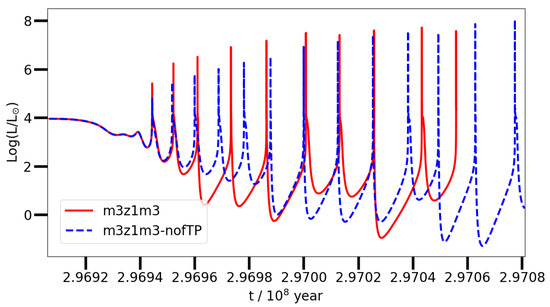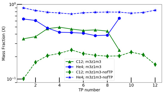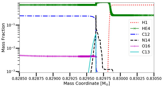 - Battino, U.; Pignatari, M.; Ritter, C.; Herwig, F.; Denisenkov, P.; Den Hartogh, J.W.; Trappitsch, R.; Hirschi, R.; Freytag, B.; Thielemann, F.; et al. Application of a Theory and Simulation-based Convective Boundary Mixing Model for AGB Star Evolution and Nucleosynthesis. Astrophys. J. 2016, 827, 30. [Google Scholar] [CrossRef]