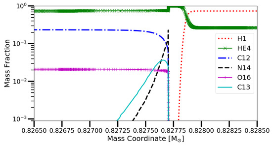 - Ritter, C.; Andrassy, R.; Côté, B.; Herwig, F.; Woodward, P.R.; Pignatari, M.; Jones, S. Convective-reactive nucleosynthesis of K, Sc, Cl and p-process isotopes in O-C shell mergers. Mon. Not. R. Astron. Soc. 2018, 474, L1–L6. [Google Scholar] [CrossRef]