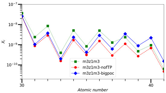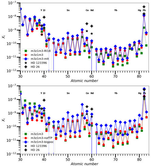 - Den Hartogh, J.W.; Hirschi, R.; Lugaro, M.; Doherty, C.L.; Battino, U.; Herwig, F.; Pignatari, M.; Eggenberger, P. The s process in rotating low-mass AGB stars. Nucleosynthesis calculations in models matching asteroseismic constraints. Astron. Astrophys. 2019, 629, A123. [Google Scholar] [CrossRef]