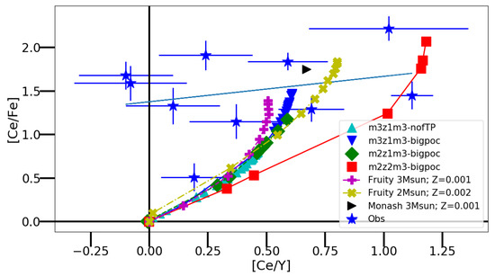 - Fishlock, C.K.; Karakas, A.I.; Lugaro, M.; Yong, D. Evolution and Nucleosynthesis of Asymptotic Giant Branch Stellar Models of Low Metallicity. Astrophys. J. 2014, 797, 44. [Google Scholar] [CrossRef]