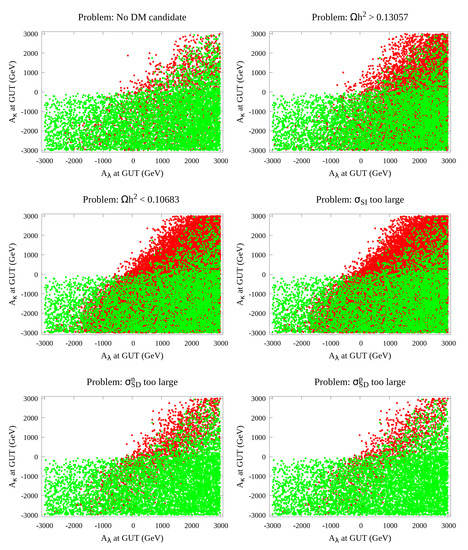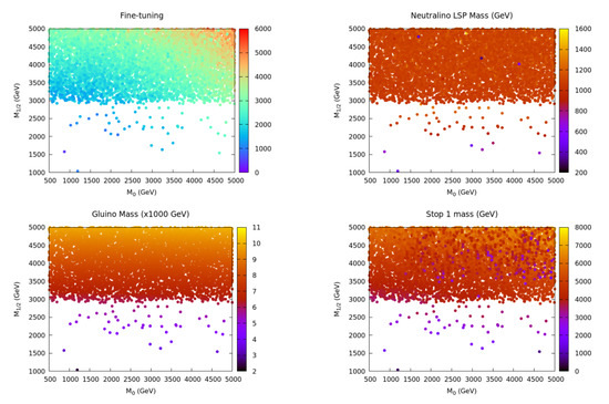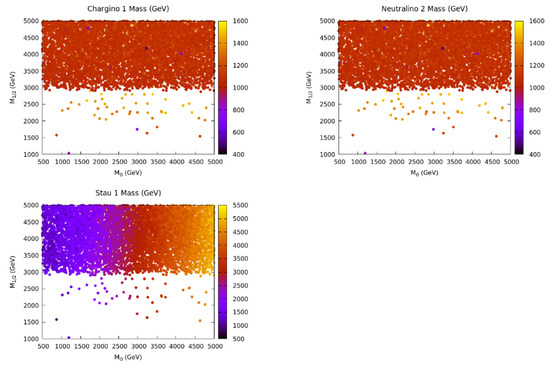 Figure 5 show that the mass of the gluino, lightest stop, lightest chargino, sencond-lightest neutralino, and the lightest stau range within [2326–10,050], [489–7202], [487–1528], [491–1532], and [787–5239] GeV, respectively. Finally, in the allowed parameter space, the lightest chargino is the next-to-lightest supersymmetric particle (NLSP), and, in general, the mass of the LSP is linearly correlated with the lightest chargino and the second-lightest neutralino.