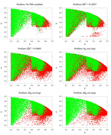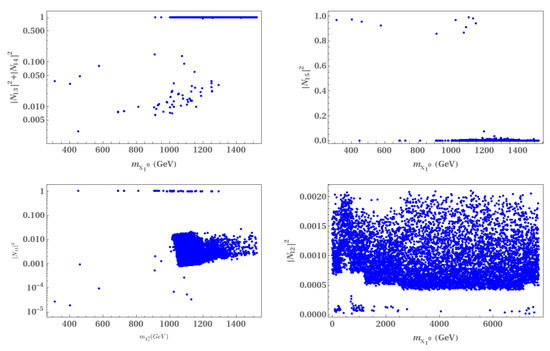 Table A2. It is possible to find cases where the DM particle is a singlino–higgsino mixture. For instance, in the allowed parameter space, we find a point where