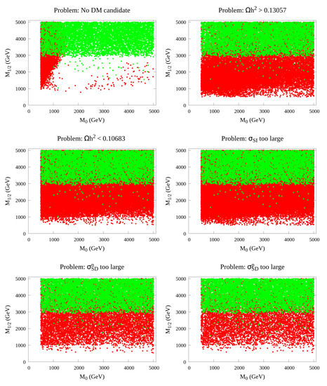 GeV. However, these are somewhat less relevant than the previous two constraints that occur in the same area. These results also show that the good points (in green) are concentrated in regions where