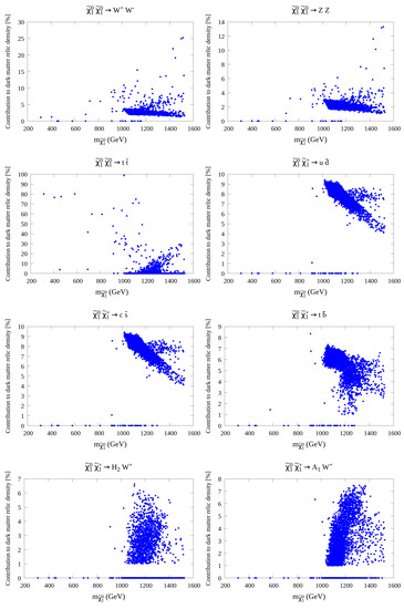 The last co-annihilation mode considered here is , which is shown in the bottom right panel. The data points are spread between GeV, corresponding to a contribution of 6.35%, and GeV, corresponding to a contribution of 3.1%. The maximum contribution is 7.1%, associated with GeV. Most data points are located at = 1043–1338 GeV, with a contribution range of 0.97–6.82%.