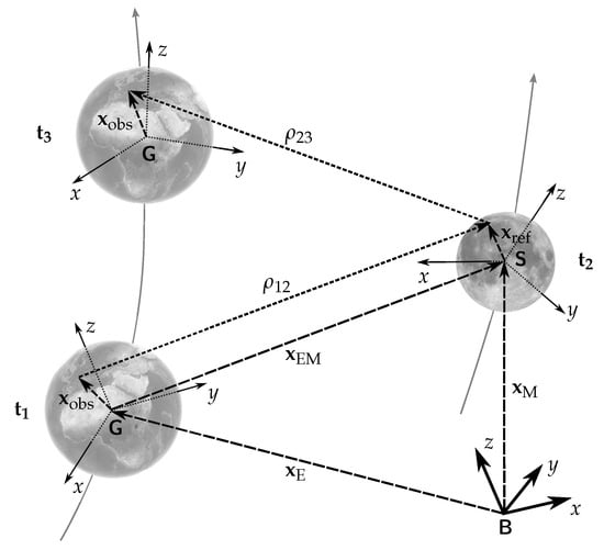 Scheme of a Lunar Laser Ranging (LLR) measurement in the moving Earth–Moon system with the solar system barycenter B, geocenter G, and selenocenter S, and the transmitting time , reflection time , and detection time . The vectors are as the barycentric vector to the geocenter at time , as the barycentric vector to the selenocenter at time , as the Earth–Moon vector of the outgoing light path, as the vector from the geocenter to the observatory in the barycentric system at the times and , as vector the selenocenter-reflector in the barycentric system at the time . , as the length of outgoing and incoming light path. indicate the different reference systems of the bodies and the solar system [13].