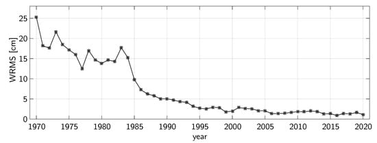 Annual weighted rms (wrms) of the one-way post-fit residuals for 27,485 NP for the time span April 1970 to April 2020.