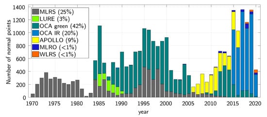 Distribution of the 27,485 normal points over the the time span April 1970–April 2020. In the legend the percentages of the contribution of the respective observatories are given. The three observatories McDonald, MLRS1 and MLRS2 are linked in the analysis and listed here as MLRS.