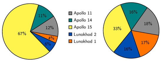 Figure 3 shows the temporal distribution of the measured NP over the last 50 years. One can see in the legend that more than 60% of the NP were observed by OCA (42% with green and 20% with IR laser light). In the last years, only OCA and APOLLO provided regular NP, some NP also came from MLRO and WLRS. For the year 2019, 90% of the NP were measured by OCA in IR. It is clear that, with this distribution of NP, the analysis is dominated by the OCA NP. Looking at the distribution of the NP according to the respective reflectors, Figure 4 shows it for the whole time span in the left pie. Here, the clear domination of Apollo 15 is obvious. Because Apollo 15 gives the strongest reflected signal due to its large size, it was more often tracked by the observatories in the past. This was not beneficial for the data analysis. In recent years and with IR NP the situation has improved considerably. For 2019 (shown in Figure 4, right pie) all retro-reflectors were measured approximately equally often, because of the advantage of IR laser light [1]. That is also a big advantage for the analysis, especially for the determination of the lunar libration.