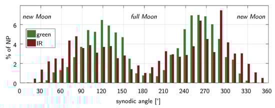 With the better performance of the measurements now also ranging near new and full Moon is possible [1] for OCA and WLRS. This leads to a better coverage of the lunar orbit over the synodic month. The synodic month is the time span, when Sun, Earth, and Moon are in the same constellation again. To illustrate the better coverage, Figure 5 shows the percentage of the NP measured for a specific angle of the synodic month. Indicated in green are the measurements with green laser light, and in red the measurements with IR laser light are given. In the past, when using only green NP there were gaps in the phases of new and full Moon. Now there are many more observations in IR and the advantage of it is obvious. The more equal distribution of the NP over the synodic month leads to a better coverage of the lunar orbit and is a big benefit for the determination of various parameters.