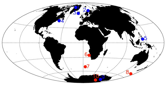 Locations of 10 sites of the reconstructed temperature data adopted in this study. Blue dots denote locations of temperatures with positive correlations to sunspot number (SSN) reported in Table 1 (see also Figure 5), and red dots denote those with negative correlations to SSN. A rough pattern of opposing inter-hemispheric seesaw temperature responses to solar variations on the millennial timescale over the Holocene, with the one exception of T9, is indicated.
