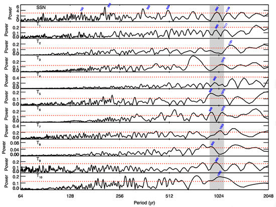 The Lomb–Scargle periodograms of SSN and 10 temperatures on Earth during the study interval (BC 7290–AD 1850). The red horizontal dotted lines denote the 95% confidence levels. The shaded region represents the Eddy cycle (roughly 900 years to 1100 years).