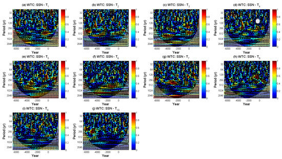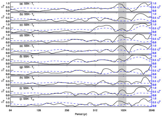 In order to further disclose potential relations between solar variability and temperature change on Earth, we used the Wavelet Coherence (WTC) tool [30] to compute the wavelet coherence between SSN and temperatures. Figure 3 gives the squared wavelet coherence (Cw) between SSN and T1, T2, …, T10, respectively. The definition of Cw can be found in Equation (8) of [30]. Most high-correlation regions appear as “isolated islands”, except for the high-power region around the millennium cycle. SSN had a good correlation to temperatures at this millennial cycle. The wavelet coherences at 1000-year cyclicity were stronger for T3, T4, T5 and T6 than those for the temperatures at other locations.