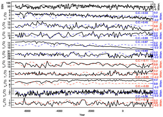 For a better display of the millennial evolutions of solar variability and climate changes on Earth, we used a band-pass filter to extract millennial signals from original data. The filter was designed to be centered at 1000 years, and its two half-power points were at 1000 ± 100 years. The output signals are shown in Figure 5 (thin lines). The millennial variations of SSN had a consistent trend with those of T1, T2, T3, T4, T5, T9, and positive correlations existed between them. The linear Pearson correlation coefficients (CCs) between SSN and these temperatures ranged from 0.36 (T9) to 0.93 (T3) (see values listed in Table 1). As for T6, T7, T8, T10, their changing trends were converse to that of SSN with negative correlations; T10 had the strongest negative correlation to SSN (CC = −0.74); and T6 had the weakest negative correlations (CC = −0.11). We adopted the tool developed by Macias-Fauria et al. [35] to estimate the statistical significance of these CCs. In this tool, a combination of Monte Carlo iterations and time-series modeling in the frequency [36] or temporal domains [37] was adopted to estimate the significance of CC by comparing the correlation to the distribution of correlations between the second target series and the random-phase series, which had the same periodogram as the first target series [36]. The CCs and their significance levels (p) between SSN and temperatures are shown in Table 2 as well.