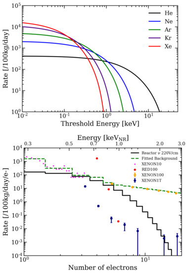 We then calculate the CENS rates from the reactor anti-neutrinos for several different noble element targets, shown in Figure 1 (top), assuming an anti-neutrino flux of , which is approximately the flux at a distance of 25 m from the core of a 3 GW thermal power reactor []. The energy of the nuclear recoils from CENS on a xenon target is smaller than 1 keV, making the detection very challenging. If a liquid xenon detector reaches a NR threshold of 300 eV, ~10 events/kg/day would be detected. Other noble elements can also be used. The total number of CENS events from neutrinos on the lighter element is smaller, but the energy transfer is larger. In order to detect about 10 events/kg/day, detectors with Ne, Ar, Kr, or Xe elements all require sub-keV NR threshold. A detector with He target will require a larger target mass to detect similar number of events per kg per day. The detector technologies for different noble elements, including the cryogenics, photosensors, and purification are different. In this paper, we focus on the study of the liquid xenon target for which the detector technology was well developed.