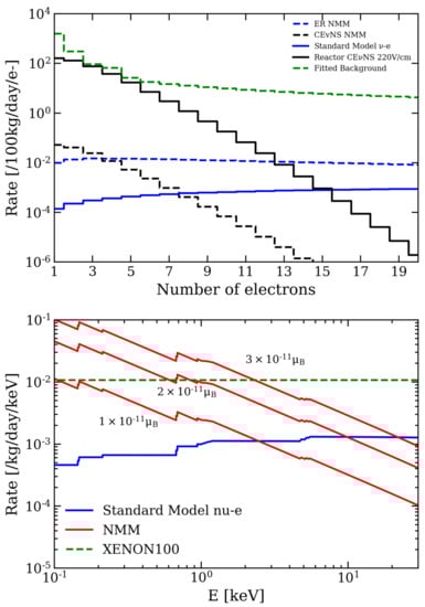 The 90% upper limit to is thus calculated in two ways. The first way is to use the energy spectrum from 1 keV to 10 keV (Figure 3 bottom) where the electronic recoil background is well understood and can be controlled, the second way is to use the signal and backgrounds from the ionization-only channel from 10–20 ionization electrons as shown in Figure 3 (top). For the ionization-only approach, the ER backgrounds are converted into the number of ionization electrons via the NEST charge yields []. The background rate increases substantially due to the reduced capability of rejecting background events based on their position distribution in the sensitive target. In addition to the instrumental background at single to a few electron level, the Standard Model CENS also contributes significantly to the ionization-only event rate below 10 e. A large neutrino magnetic moment would also give a small enhancement of the CENS event rate according to []