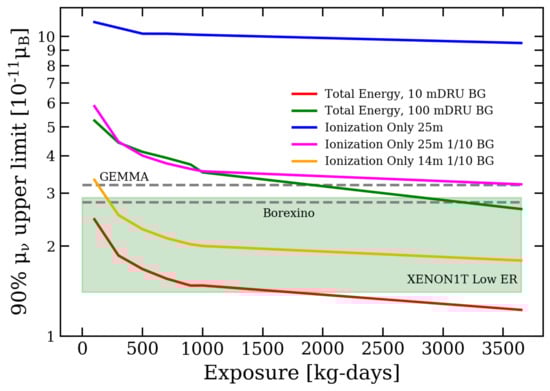 The sensitivity using the ionization-only channel is limited by the high background with only S2 signals. We also calculated the ionization-only sensitivity in the case that the background can be reduced by a factor of ten with the detector developments mentioned in Section 2 to reduce the single-and-few electron background. This is assuming that the impurity in liquid xenon can be reduced by a factor of ten or the electrons trapped at the liquid–gas interface can be reduced by a factor of ten. Due to the limitation of space near the reactor core, we keep a conservative distance of 25 m from the reactor core for the standard rate calculation. However, if space closer to the reactor core, e.g., 14 m, is available, the flux can be increased thus increasing the sensitivity to NMM. In any case, we get a more stringent limit by using the total energy, which necessitates the detection of the primary (S1) scintillation signal. The “total energy” channel requires more coverage of photosensors thus increasing the cost and radioactivity background from photosensor-related materials.